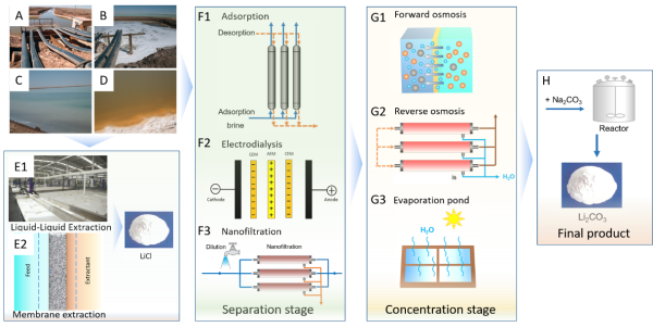 该研究阐述了盐湖卤水提锂的现有技术路线,并提出从卤水到产品的整个工艺过程包括分离纯化和浓缩两个关键步骤(图1)。工艺技术包括:一步实现锂的分离富集的液液萃取(E1)和膜化学交换(E2)技术,该技术一般获得氯化锂产品;锂镁分离和锂浓缩两个工段的耦合工艺技术,如吸附(F1)、电渗析(F2)或纳滤(F3)用于镁锂分离,然后通过正渗透(G1)、反渗透(G2)或蒸发塘(G3)与其他浓缩技术浓缩含锂卤水,最后通过添加碳酸钠(H),得到碳酸锂产品。