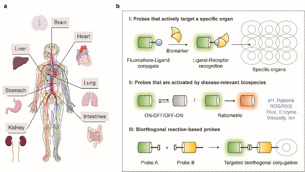综述中涉及的人体主要器官示意图(a)及用于探查器官相关疾病的小分子荧光探针的设计策略示意图(b)