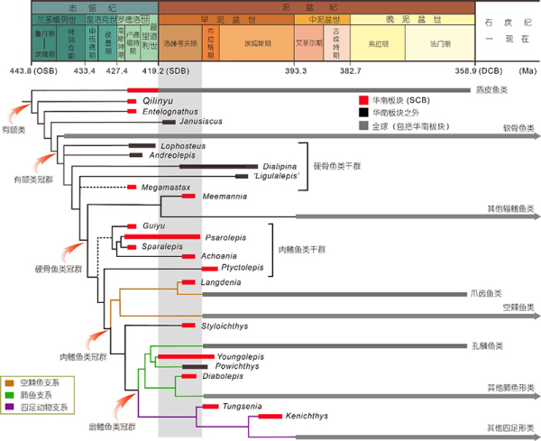 图3.肉鳍鱼类支系(包括现生空棘鱼类、肺鱼类及四足动物)的系统发育及地史分布