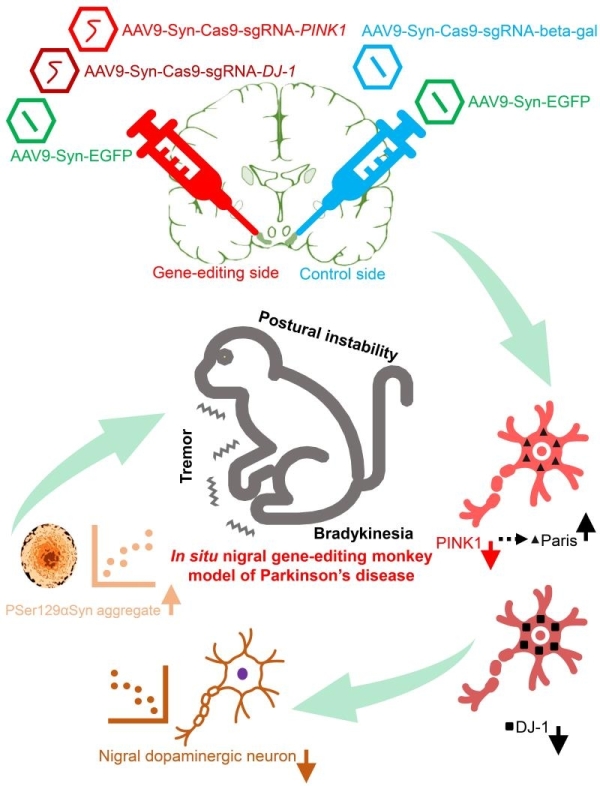 AAV9介导的CRISPR/Cas9基因编辑导致成年猕猴出现帕金森病核心表型