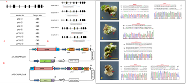 图2.CRISPR/cas9载体构建过程、不同愈伤中突变的Sanger测序示例及阳性愈伤组织