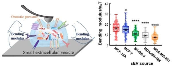 近年来,关于细胞外囊泡生物力学性质的研究较少,以杨氏模量作为评估指标而表观地分析囊泡的刚度,缺乏对囊泡内在纳米力学性质,如弯曲模量和渗透压等对囊泡刚度的探讨。在该工作中,中国科学院国家纳米科学中心研究员杨延莲和王琛等利用原子力显微镜在单个细胞外囊泡水平上研究了其力学行为,剖析了囊泡的内在纳米力学性质,通过设计纳米压痕实验研究了弯曲模量和渗透压等对囊泡刚度的影响,并通过建立新的力学模型对囊泡的力学行为进行定量分析。通过比较不同恶性程度和不同大小的细胞外囊泡,研究建立了细胞外囊泡纳米力学性质与肿瘤恶性程度以及尺寸大小的关系,这有助于建立以细胞外囊泡纳米力学性质为生物标志物的肿瘤恶性程度评估方法和标准。另外,细胞外囊泡具有高生物相容性、低免疫原性等特点,因此被越来越多地用作一种药物递送载体。研究细胞囊泡的生物力学性质可为设计和优化以细胞外囊泡为基础的纳米药物载体,通过调节其刚度从而提高药物递送效率提供帮助。
