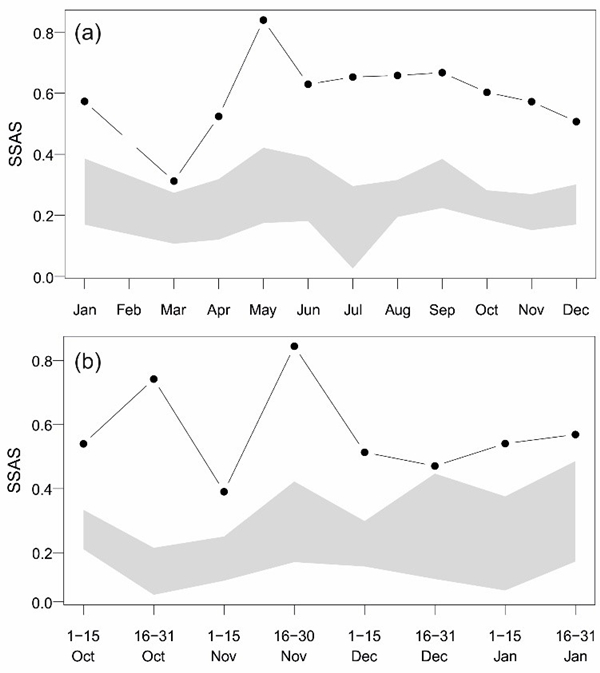 图2.雌雄鹅喉羚在不同时间尺度(月和15天)的同性聚群模式。图中观察值(黑点)在预期区间(灰色区)上部,表明雌雄个体以分离为主;观察值在预期区间下部,表明二者聚集分布;观察值在预期区间之间,表明二者随机分布。