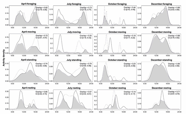 图3.雌雄鹅喉羚在不同季节的四种行为时间分配重叠模式。第一至第四排分别为采食、移动、站立和休息。灰色区域表示雄性和雌性行为时间分配重叠系数。重叠系数范围为0(无重叠)至1(完全重叠)。