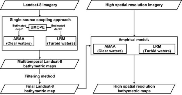 研究利用Landsat-8(空间分辨率等于30 m)的波段设置优势和高空间分辨率卫星数据空间分辨率高的优势,建立了降尺度水深反演模型downscaled bathymetric mapping approach(DBMA)。该模型运用耦合优化反演模型和经验模型的思路,在多时相Landsat-8数据中反演出水深,而后使用Landsat-8反演的水深对基于高分辨率卫星数据(国产高分1/2、国产资源3、Sentinel-2A/B和Worldview-2)的经验模型进行定标,从而实现高空间分辨率水深信息的获取。