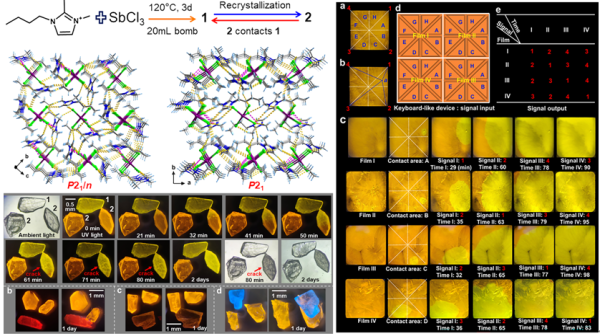 近日,中国科学院福建物质结构研究所结构化学国家重点实验室研究员黄小荥领导的课题组等在前期研究基础上,利用含有丁基链的咪唑基离子液体[Bmmim]Cl(Bmmim = 1-丁基-2, 3-二甲基咪唑鎓阳离子)具有多稳态构象的特性,设计了一种具有多稳态结构的零维金属卤化物发光材料。通过改变合成方法(离子热和重结晶),他们制备了黄光发射的α-[Bmmim]2SbCl5 (1) 和橙光发射的β-[Bmmim]2SbCl5 (2) 两例锑卤化物异构体,对它们的光物理性能进行了系统研究。有趣的是,两个异构体的单晶在相互接触条件下可以发生特异性识别现象,实现类似于多米诺效应的单晶到单晶的相变。基于对实验现象的观察和表征技术,他们提出了晶相识别这一分子识别领域的新机制,并进一步研究了这一新型发光转变模式在时间分辨的信息加密领域的潜在应用。