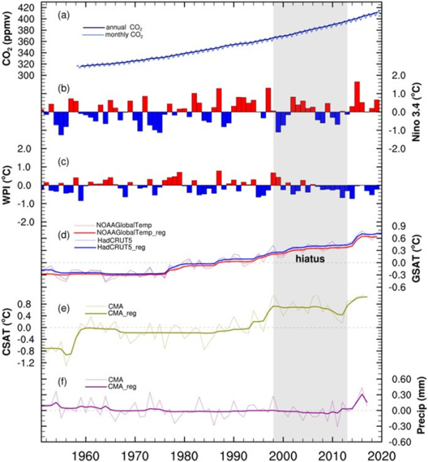 工业革命以来,随着温室气体浓度持续升高,全球变暖进一步加剧。自1997/1998年到2013年左右的十几年期间,虽然温室气体浓度持续增长,但是全球地面气温没有明显增加,甚至出现变冷,这一现象被称为全球变暖停滞。变暖停滞期间,中国气候,特别是极端气候是如何变化的?
