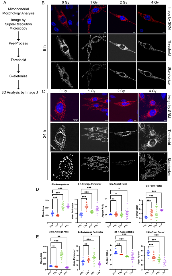 图5.细胞辐照6小时和24小时后线粒体形态的分析