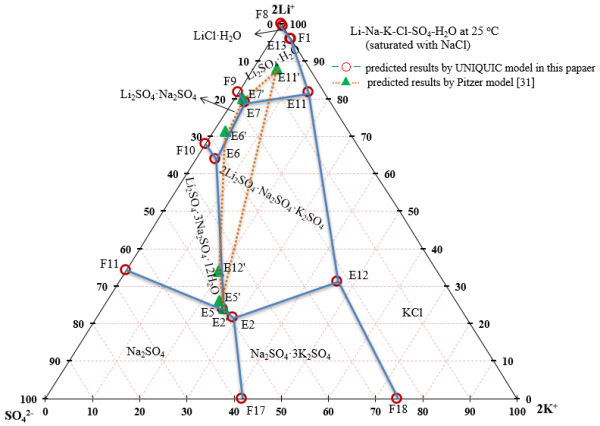 中国科学院青海盐湖研究所研究员李军课题组基于Thomsen建立的扩展UNIQUAC模型,利用定制Li–Na–K–Mg(Ca)–Cl–SO4–CO3(HCO3)–Borate–H2O多元体系模拟软件AQSOL027,针对简化的含锂盐湖卤水体系Li–Na–K–Mg–Cl–SO4–H2O进行了多温相平衡的理论模拟,构建了该体系下五元次级体系在多温相图。多个五元次级体系多温相图与已有实验相图、他人报道的计算相图对比显示,扩展UNIQUAC模型能够实现对上述卤水体系展开多温相平衡理论预测。该计算相图软件可用于指导实验相图的加速构建;结合大型过程模拟软件,可针对青藏高原含锂盐湖卤水资源的综合利用开展计算机辅助设计。