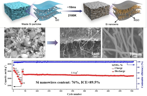近年,在碳中和目标指引下,光伏太阳能产业发展迅猛。然而,在硅片制造过程中会产生硅废料,且目前仅能降级利用。为此,过程工程所王志研究员团队针对硅废料粒度细(~1μm)、氧化膜包裹和微量杂质夹带造成其高值化利用难的问题,提出了一种绿色、高效的增值循环再生策略,充分发挥硅废料氧化膜的限域和缺陷的诱导作用,通过闪速加热和淬冷提供大梯度热场(~105 K/s)驱动受限空间内硅原子的定向扩散以达到硅纳米线的快速生长,电极首效高达89.5%,循环超500次容量仍大于2300 mAh g-1,达到国际先进水平。