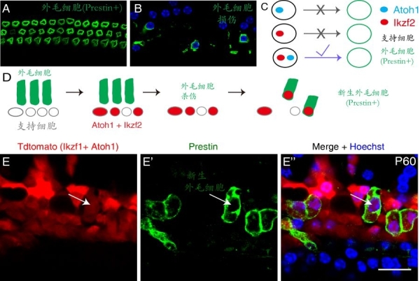 Ikzf2是在耳蜗外毛细胞特异表达的一个基因,其功能突变导致外毛细胞发育障碍。刘志勇研究组提出研究假说:同时过表达Atoh1和Ikzf2能够把成年小鼠支持细胞转分化为Prestin阳性的外毛细胞。实验结果证实这一假说(图1C、D):单独Atoh1或Ikzf2均不能转分化成年小鼠支持细胞,但Atoh1和Ikzf2一起可以把成年小鼠支持细胞转变为Prestin阳性的外毛细胞(箭头,图1E-E”)。Atoh1和Ikzf2协同转分化效率在外毛细胞损伤的模型中得到提高,达到16%-29%。
