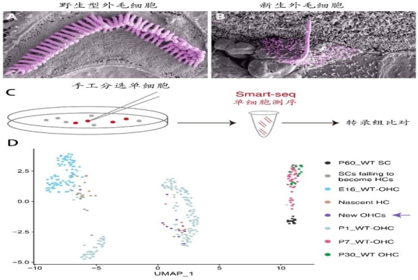 图2.新生外毛细胞超微结构和转录组分析。(A)野生型外毛细胞顶部的纤毛呈V字形。(B)杀伤再生后的新生外毛细胞的纤毛形状不规则。(C)结合手工分选和smartseq单细胞测序的办法进行转录组分析。(D)转录组分析显示新生外毛细胞(紫色箭头)和新生野生型外毛细胞(P1_WT OHC)更接近。