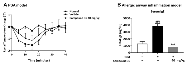 过敏性疾病是慢性疾病,常见过敏性疾病包括食物过敏、药物过敏、过敏性鼻炎、哮喘、荨麻疹、湿疹、过敏性结膜炎以及特应性皮炎等,机体针对抗原产生特异性IgE抗体为主要特征。由于过敏性疾病致病因素复杂,抗过敏类治疗药物主要是纠正机体免疫系统失调和抑制变态反应性炎症,而药物存在副作用强、靶点单一及响应率低等缺点。目前,从根本上控制并抑制过敏性炎症的治疗方案是抗体疗法,用于部分严重、不可控性过敏性疾病患者的治疗,但该疗法存在治疗周期长、患者顺应性差、费用昂贵等问题。因此,开发具有强效抗过敏活性且不良反应低的新型抗过敏小分子药物颇具临床应用价值。