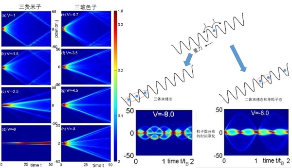 三费米子和三玻色子量子行走。左图:粒子数分布函数的时间演化,展现统计依赖的量子行走。右图:在重力梯度作用下的量子行走,在周期性格点中的三粒子共同行走,或两粒子共同行走伴随单粒子行走,它们在重力下由于物质波的干涉效应只能在很小的范围震荡—称为布洛赫振荡,右下图分别展现3倍频、2倍频及单倍频的布洛赫振荡