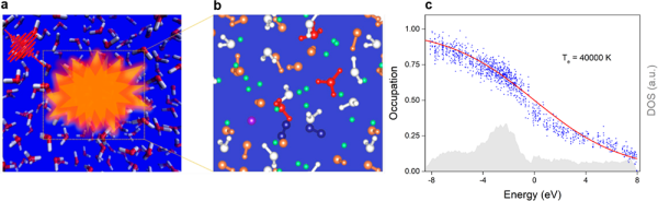 图1.激光诱导液态水中的等离子体产生(a,b)和对应的金属型的电子态密度(c)。