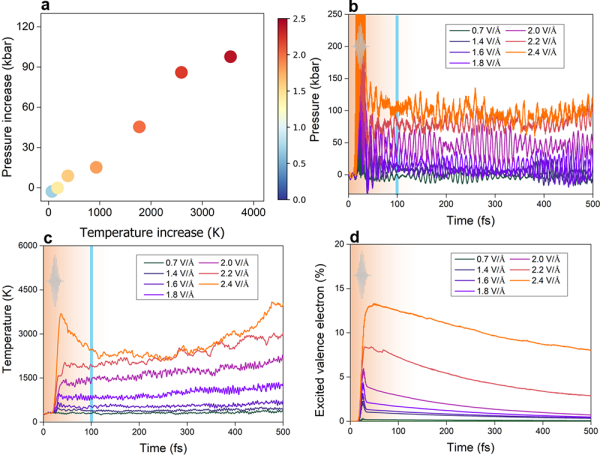 图2.激光辐照下液态水的压强、温度和激发的电子数随时间的超快变化。