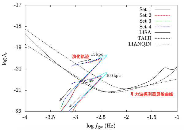 图3 由中子星+氦星模型形成的极致密X射线双星的引力波信号,其中箭头的方向表示的是极致密X射线双星的演化轨迹