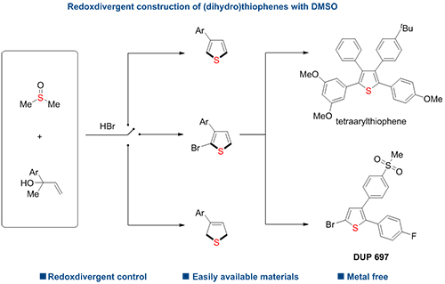 陈庆安团队长期致力于发展不同催化体系,以实现烯烃选择性催化转化与合成。在前期相关研究(Angew. Chem. Int. Ed.,2019;Angew. Chem. Int. Ed.,2020;Angew. Chem. Int. Ed., 2021;Angew. Chem. Int. Ed.,2021)基础上,科研人员以二烯前体烯丙醇和DMSO、HBr为原料,采用氧化还原发散性的策略构建噻吩和二氢噻吩。研究通过简单改变DMSO和HBr的用量来调控氧化还原程度,从而得到不同氧化还原态的产物。此外,团队还进行一系列控制实验和动力学研究,解释了反应的机理和氧化还原态控制的原因。为进一步验证该反应的实用性,研究通过转化实验,利用(二氢)噻吩产物得到一系列五元含硫杂环化合物,快速地程序化合成不同四芳基取代的噻吩、环氧合酶-2(COX-2)抑制剂DUP 697及其区域异构体。
