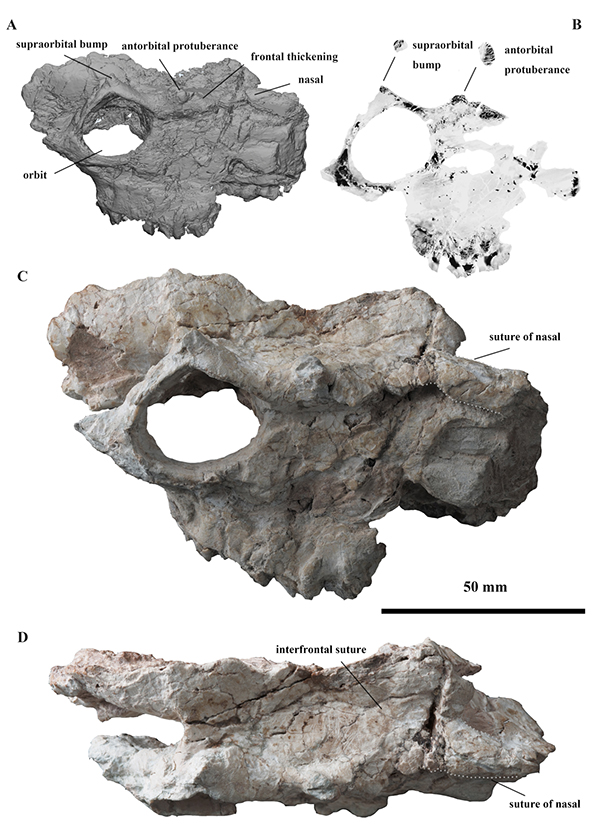 研究展示了半麝头骨上发育的附属结构,西水半麝(Amphimoschus xishuiensis)保留有眶上隆起、眶前隆起和加厚的额骨。其中,眶上隆起位于眼眶正上方,或与反刍动物的角联系紧密。眶前隆起出现在头骨的左右两侧,这样的结构还见于早期的恐角兽类和原角兽类,被认为是采取头部侧向攻击的证据;而额骨的加厚可能是源于头部撞击过程中额骨的适应支撑。研究人员据此推测,西水半麝头骨附属物的功能极有可能与牛角在领地性行为中的作用类似。