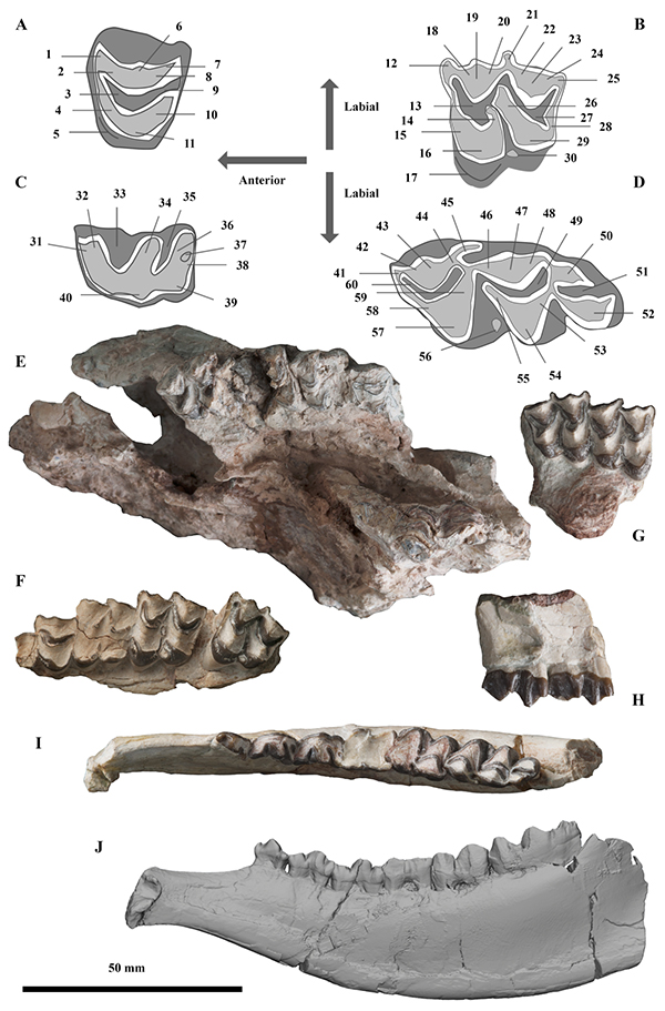 近日,一支以中国科学院古脊椎动物与古人类研究所研究员邓涛、李强,与南京大学博士李刈昆博士等组成的中外合作团队,在《林奈动物学报》上在线发表了题为The early evolution of cranial appendages in Bovoidea revealed by new species of Amphimoschus (Mammalia: Ruminantia) from China的论文。该研究报道了青藏高原北缘、甘肃省塔奔布鲁克盆地西水沟地点反刍动物化石的最新成果。此次报道的材料包括一件部分保存的头骨,一件较为完整的下颌和两件部分保存的上颌。科研人员依据颊齿的形态学特征,如具有发育的下外附尖/下内尖,下原尖后外嵴(古鹿褶)缺失,下m3第三叶呈现双新月形、具有发育的下内小尖等,将其归为半麝属(Amphimoschus);而依据该属首次出现的头骨附属物,包括眶上隆起、眶前隆起和加厚的额骨等,将其建立为新种西水半麝(Amphimoschus xishuiensis)。