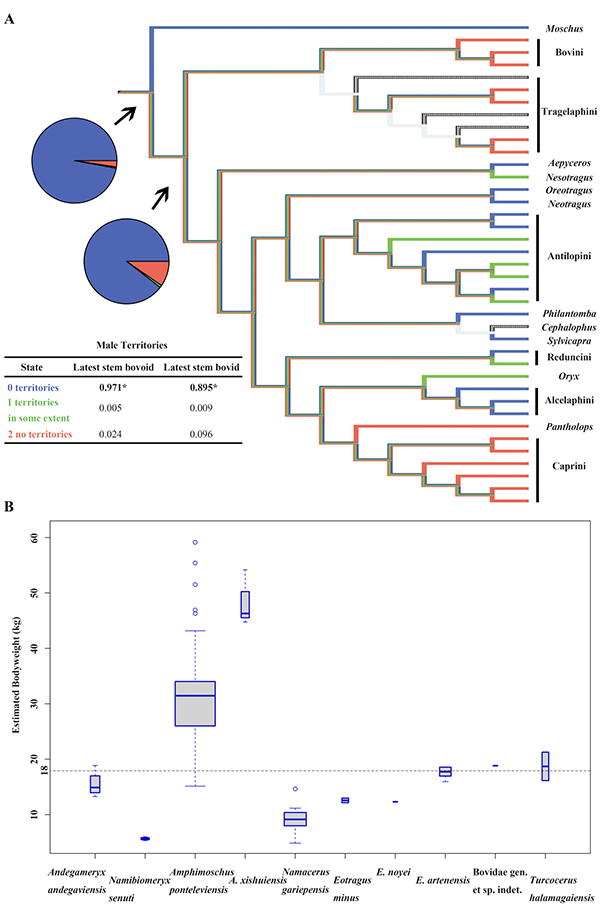 为了推断早期反刍动物的领地性行为,科研人员收集了现生牛科和麝科动物的行为学特征,包括一直生活于领地之中、在发情期或特别的情形下展示出暂时的领地性和无领地性等。研究依据最大似然法对现生反刍类基因组推断出的系统发育关系进行祖先特征重建,得出最晚基干类群的牛科和牛总科成员统计学上显著地展示出具有领地性,一直生活于领地之中。