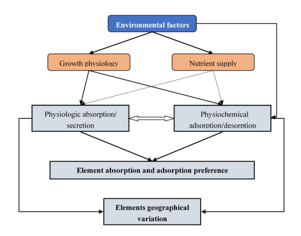 图2.模式图显示生理作用主导不同矿质的吸收或吸附
