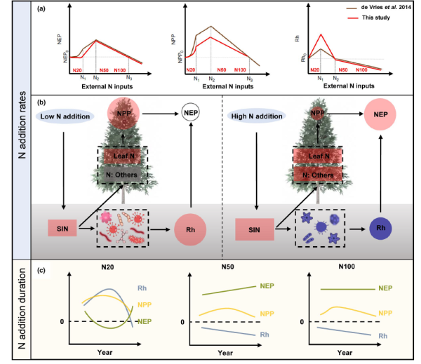 工业革命以来化石燃料燃烧以及农业化肥施用导致大气氮沉降增加,而北方森林是陆地生态系统氮限制强烈的生态系统,因此氮沉降对北方森林生态系统碳循环具有重要影响。生态系统碳平衡取决于净初级生产力和异养呼吸碳排放之间的平衡,但当前开展于北方森林的研究多关注植物净初级生产力对氮添加的响应,缺乏北方森林土壤异养呼吸碳排放以及生态系统碳平衡对氮沉降响应的长期实验研究。
