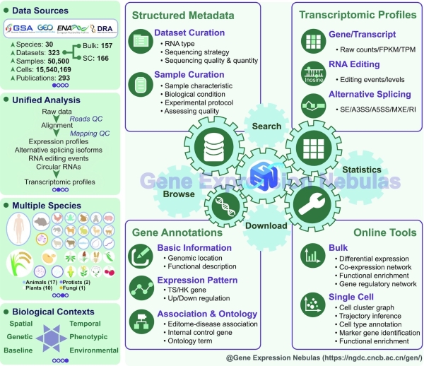 近日,中国科学院北京基因组研究所(国家生物信息中心)国家基因组科学数据中心在Nucleic Acids Research上,发表了题为Gene Expression Nebulas (GEN): a comprehensive data portal integrating transcriptomic profiles across multiple species at both bulk and single-cell levels的论文,建立了基于常规转录组测序(Bulk RNA-seq)和单细胞转录组测序(scRNA-seq)数据挖掘解析的多物种转录图谱整合型数据库——Gene Expression Nebulas(GEN)。GEN应用结构化审编模型和标准化数据处理流程,对组织和细胞水平转录组测序数据集进行统一分析,实现了多物种多层面转录调控水平信息的系统整合。目前,GEN整合了323个高质量转录组数据集,涵盖30个物种的50,500个样本和15,540,169个细胞,提供基准参考、遗传、表型、环境、时间、空间六类生物学场景下的转录图谱,为生物医学领域科研人员剖析基因遗传调控结构和功能机制提供基础资源。