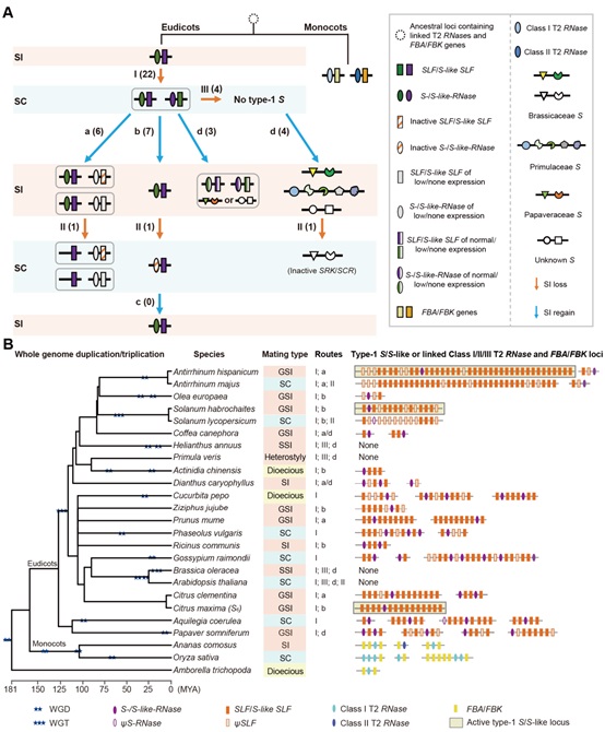 研究人员进一步发现,由紧密连锁的分别编码雌性自交不亲和决定因子T2类核酸酶和雄性自交不亲和决定因子FBK或FBA结构域蛋白的S基因所控制的1类SI可能在被子植物起源之初即已产生,表明该类S位点极其古老,可能与被子植物的起源和扩张有关。然而,随着全基因组复制事件的频繁发生或1类S位点的删除,1类SI经历了多次丢失并产生了多个自交亲和物种。尽管如此,一些物种通过删除或失活重复的1类S位点进而重新获得了1类SI,另一些物种则进化出了新的2、3或4类自交不亲和机制。这些结果揭示了SI的起源和进化机制,为深入研究被子植物的起源和扩张提供了一个新的分子进化理论框架。