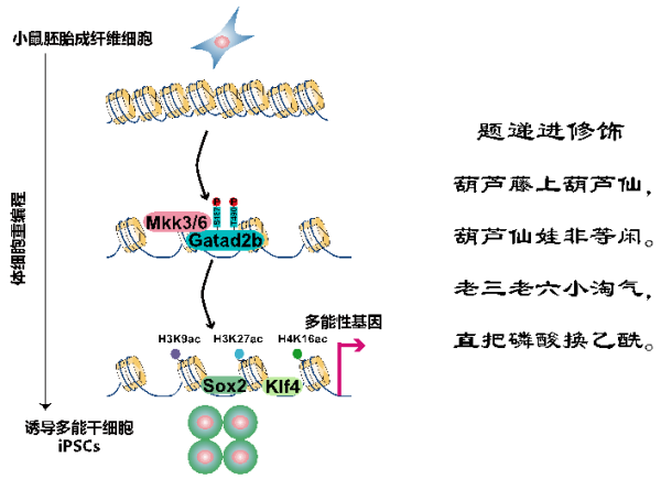 在经典的激酶信号通路中,信号通过蛋白磷酸化传递;而最新研究发现信号可由蛋白磷酸化递进传递到蛋白的乙酰化。研究显示,二级激酶家族7个蛋白中MAP2K3/6可通过磷酸化Gatad2b进而调控组蛋白的乙酰化。这表明了不同的蛋白翻译后修饰存在着“递进修饰”的信号转导新模式,并在多能干细胞命运调控中发挥重要功能。这正像“葫芦娃”七兄弟中的老三、老六,具有把磷酸化信号变为乙酰化信号的“递进修饰”特殊本领。