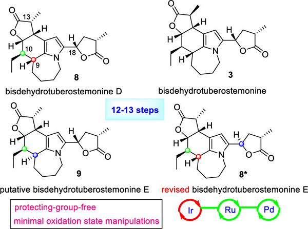 研究从廉价的5-甲酰基-1H-吡咯-2-羧酸甲酯出发,三次创造性运用Ir催化不对称烯丙基化,同时结合Ru和Pd过渡金属催化反应,仅用12步或13步,全程无使用任何保护基,简洁高效地实现了三个bisdehydrotuberostemonine型百部碱的不对称全合成。其中,bisdehydrotuberostemonine D和E为首次合成。此外,科研人员纠正了此前报道的bisdehydrotuberostemonine E错误结构,并阐明了吡咯百部碱的结构不稳定的原因。