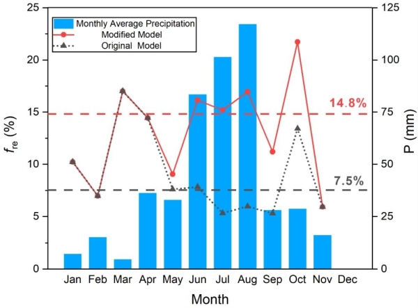 图3.模型修正前后固原降水再循环比(fre)月变化图