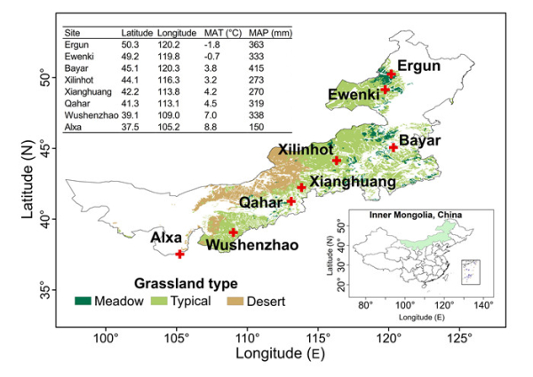 图1 研究区八个长期定位牧试站的分布,MAT和MAP分别为多年平均温度和降水,Meadow、Typical、Desert分别表示草甸草原、典型草原和荒漠草原
