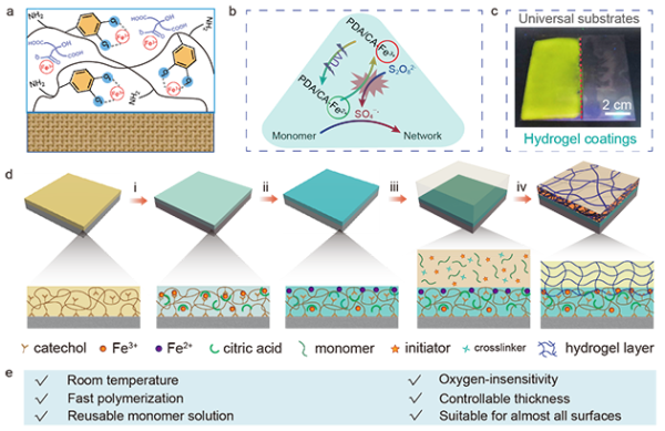 人口老龄化对植介入医疗器械提出了紧迫需求。在器械表面构筑亲水润滑涂层,可有效减小其与组织界面的摩擦力、降低手术操作难度、减小病人痛苦、延长器械使用寿命。水凝胶是一类具有典型湿滑特征的高分子材料,表面修饰水凝胶涂层可有效改变材料与器械表面的润滑特征。然而,现有的修饰方法普遍存在基材通用性差、涂层厚度不可控等问题。如何实现在通用材料和器械表面可控生长水凝胶润滑涂层,仍是该领域的科学难点。