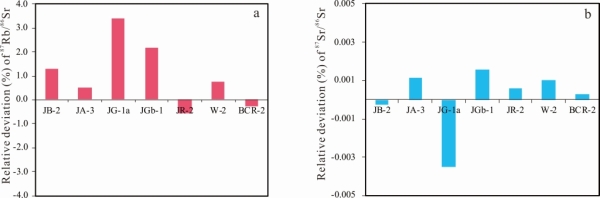 图2 本方法对一系列国际岩石标样的87Rb/86Sr和87Sr/86Sr比值的测试偏差