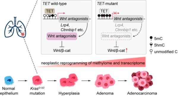 近日,中国科学院分子细胞科学卓越创新中心(生物化学与细胞生物学研究所)徐国良研究组和季红斌研究组合作,以Loss of TET reprograms Wnt signaling through impaired demethylation to promote lung cancer development为题在PNAS上在线发表最新研究成果。通过对公共临床数据的深入分析并结合一系列临床前的自发成瘤小鼠模型,该研究揭示了DNA双加氧酶TET家族蛋白调控肺上皮细胞癌变过程中DNA甲基化的动态平衡,维持肺腺癌(lung adenocarcinoma, LUAD)发生发展中关键致癌信号通路Wnt signaling的拮抗基因的低甲基化及适当的表达,以确保Wnt signaling不被过度活化,进而抑制肺上皮细胞的癌前病变及肺腺癌的恶性进展。