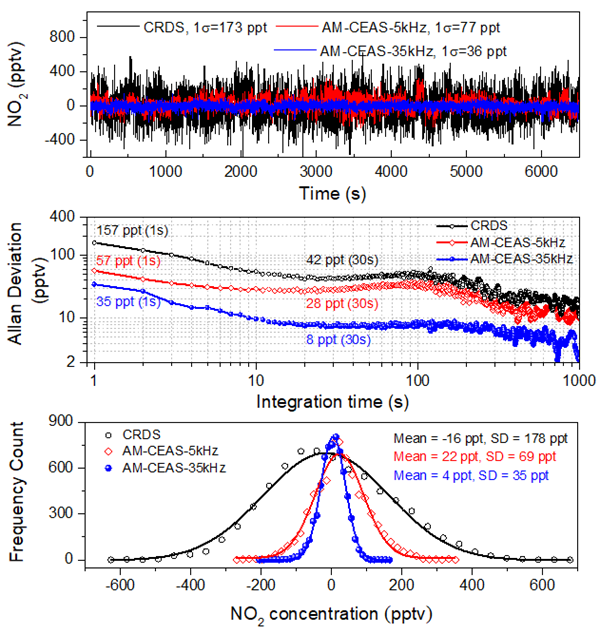 NO2是对流层大气中重要的污染物,在大气复合污染等过程中起着重要作用,其高灵敏准确测量对大气化学研究以及大气污染防控具有重要意义。研究人员发展了一种基于多模激光的振幅调制腔增强吸收光谱技术(AM-CEAS),使用宽带多模二极管激光器(中心波长406 nm),实现了NO2超高灵敏度探测,在1s和30s采样时间下,探测极限分别达到35 pptv和8 pptv,低于相同条件下腔衰荡吸收光谱技术(CRDS)探测极限的4倍。该方法利用衰荡时间测量,可免去腔镜反射率标校等过程,实现绝对浓度的直接测量,并且具有共轴腔衰荡吸收光谱的高光注入效率、离轴腔增强吸收光谱的低腔膜噪声以及调制光谱的窄带高灵敏度微弱信号探测等优点。仪器简单、可靠、低成本和可自校准,可长期稳定运行、免人工维护,具有很好的科研和业务应用前景。