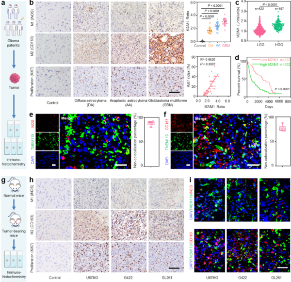 图1.胶质瘤样本中巨噬细胞的表型及其来源分析:a、胶质瘤患者临床样本中巨噬细胞表型分析示意图;b、不同级别胶质瘤中M1、M2和Ki67(细胞增殖指标)的分析;c、基于TCGA数据库分析不同级别胶质瘤中M2/M1比例;d、基于TCGA数据库分析胶质瘤患者瘤内M2/M1比例与生存曲线的关系;e、GBM组织中小胶质细胞和M1巨噬细胞的共定位分析;f、免疫荧光染色分析GBM组织中小胶质细胞和M2巨噬细胞的共定位;g、小鼠胶质瘤样本中巨噬细胞表型分析示意图;h、在不同胶质瘤细胞系(U87MG、G422和GL261)中M1、M2和Ki67的分析;i、免疫荧光染色分析不同鼠胶质瘤组织中小胶质细胞和M1或M2巨噬细胞的共定位情况;图中标尺均为50 μm。