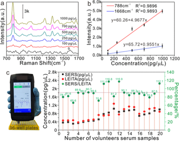该方法对抗癌药物5-氟尿嘧啶表现出50 ppb灵敏度和50-1000 ppb的定量检测范围(图2)。与传统的固体纳米阵列和胶体聚集SERS方法相比,收缩组装的液态3D热点矩阵可以增强分析物在等离子体热点空间的富集能力,实现高灵敏度和高稳定的SERS定量检测。这种收缩组装的3D热点矩阵在定量检测复杂样品(如血清、生物体液)中的分析物、动态监测抗癌药物代谢过程和生化反应动力学方面颇具潜力。