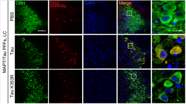 最新研究进一步探索了DOPAGEL对Tau的修饰作用,发现DOPAGEL可以直接共价修饰Tau的K353位点,与全长的Tau相比,AEP剪切形成的Tau蛋白片段更易被DOPAGEL修饰。DOPAGEL修饰的Tau蛋白聚集能力更强,且形成的病理性聚集体作为“种子”诱导Tau蛋白单体的聚集能力更强。在Tau转基因小鼠脑内阻断MAO-A的活性,或将Tau的K353位点突变后可以阻断DOPAGEL对Tau的修饰,部分缓解Tau病变的播散。