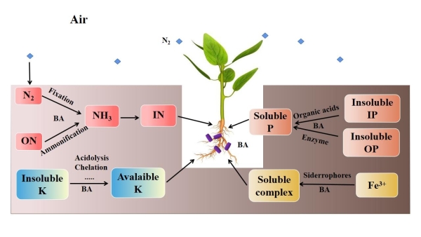 中国科学院成都生物研究所地表过程与生态系统管理项目组博士研究生罗林在研究员尹春英的指导下,基于相关文献,全面总结了BA的促生机制,并提出了目前在农业应用中的局限和未来发展方向。BA促生机制主要包括:通过生物固氮及矿化有机氮、溶磷、溶钾和产生铁载体,从而提高土壤氮、磷、钾和铁素养分的有效性;改变土壤微生物群落,进而提高矿质养分的有效性和改善作物生长的根系环境;产生与植物细胞和根系生长相关的激素和挥发性有机物质,促进植物获取养分;通过与病原菌竞争生态位和养分、产生环状脂肽等代谢物,诱导植物产生系统性抗性,促进植物对生物胁迫的抵抗。同时,BA还可以通过诱导宿主植物遗传、理化改变以提高其对非生物胁迫的耐受性。