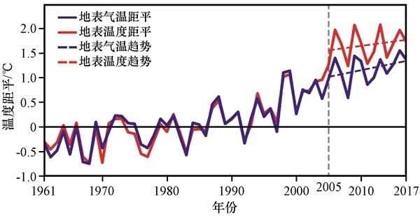图1.1961—2017年,青藏高原观测站点平均的年平均地表温度距平