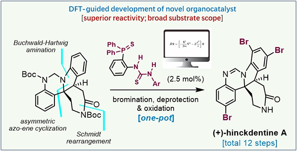中国科学院上海有机化学研究所洪然课题组在开发亚硝基-烯新反应模式和全合成应用的基础上(Angew. Chem. Int. Ed. 2015;Tetrahedron Lett. 2015;Angew. Chem. Int. Ed. 2017;Tetrahedron 2019;Chem. Rec. 2022),设计新的合成策略和卤代催化剂,完成了海洋生物碱hinckdentine A的不对称合成 (JACS Au 2022, DOI:10.1021/jacsau.2c00048)。研究首次将不对称偶氮-烯反应用于天然产物的全合成中,以构建目标分子的氮杂季碳手性中心。受路易斯碱催化与卤代酶氢键活化的启发,科研团队开发了催化溴代反应的高效有机催化剂,在合成后期实现了生源启发的三溴代反应,高效完成了hinckdentine A的全合成(如图)。上海有机所与四川大学教授苏志珊合作,通过对溴代反应的理论计算,剖析合成中关键中间体的选择、膦硫—硫脲催化剂的作用模式。催化剂通过多种非共价相互作用与底物相结合,协同活化了溴代试剂,降低了溴代反应的能垒。同时,该有机小分子催化剂应用于一系列(杂)芳环、小分子药物与天然产物的溴代和氯代反应中,对部分底物表现出特殊的区域选择性,为药物先导化合物的后期结构修饰提供了新方法。