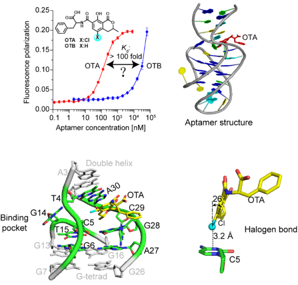 科研团队运用液体核磁共振方法,解析了核酸适体与OTA复合物在溶液中的高分辨结构,发现了OTA诱导核酸适体折叠成一个由Mg2+和Na+共同稳定的双螺旋-G-四链体结构(如图)。与已发现的小分子配体和G-四链体结合常通过配体与G-四平面直接堆积的模型不同,OTA并不直接与G-四链体相互作用,而是通过π-π堆积、卤键和疏水作用,结合在双螺旋与G-四链体结构的连接处。同时,OTA的氯原子与核酸适体碱基芳环之间形成的强卤键是核酸适体高亲和、高特异性识别OTA的关键(OTB和OTA有相同的结合位点,但缺少卤键)。该研究揭示了核酸适体高亲和、高特异性识别的结构基础,拓展了核酸适体识别靶标机制的理解,也为进一步的核酸适体优化改造以及传感检测方法的开发应用奠定了重要基础。
