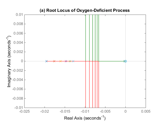 图1.系统轨迹上的一系列平衡点处的线性化模型的根轨迹:(a)乏氧、(b)富氧