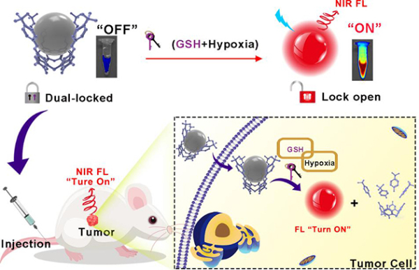 双锁定近红外荧光探针在肿瘤微环境下激活示意图