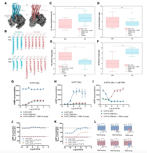 为探究G蛋白偏好5-羟色胺受体的假设,该团队进行了两组实验来检验TM5和TM6的长度是GPCR区分Gs和Gi蛋白的关键因素的假设。第一组实验是将5-HT1A受体的TM6末端螺旋断裂且TM5螺旋延伸或5-HT4、5-HT7受体的TM5末端螺旋断裂且TM6螺旋延伸,功能结果表明这种改造影响了5-HT4、5-HT7受体偶联Gs蛋白的能力,然后将5-HT1A受体由原来Gi偶联转变成了Gs偶联,这些结果支持TM5和TM6长度的“macro-switch”是G蛋白选择性的关键。第二组实验是将Gi偶联的5-HT1A的TM5-TM6区域与Gs偶联的5-HT4和5-HT7受体的TM5-TM6区域互换。研究结果表明,嵌合受体5-HT1A (5-HT4_P5.50-P6.50)与野生型5-HT4具有相似的功能,即具有高组成型激活且几乎不受配体调节。同样,5-HT1A (5-HT7_P5.50-P6.50)显示出与野生型5-HT7相似的功能,在激动剂诱导下进行的cAMP积累。如果将5-HT4和5-HT7的ICL3替换为5-HT1A,在激动剂诱导下进行的cAMP积累的能力几乎丧失,类似于野生型5-HT1A受体。综上所述,该团队以5-羟色胺家族受体为切入点揭示了A类GPCRs的Gs、Gi蛋白偶联选择性机制,并扩展了5-羟色胺受体的配体识别基础。