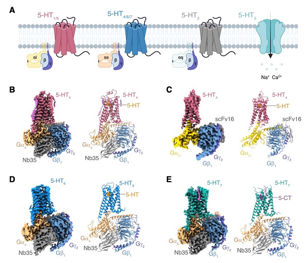 5-羟色胺(serotonin, 5-HT)是人体中枢神经系统和周围神经系统的主要神经递质之一,其通过结合5-羟色胺受体发挥调控食欲、记忆、认知,情绪调节和成瘾等生理过程,这也使5-羟色胺受体成为抑郁症、精神分裂症、偏头痛等疾病的重要治疗靶点。5-羟色胺受体家族是GPCR超家族中最复杂的亚家族之一,其包含12种亚型,不同亚型的受体在人体中发挥不同的生理功能,并且与不同种类的G蛋白偶联。其中5-HT4、5-HT6和5-HT7受体主要偶联下游Gs蛋白,5-HT1和5-HT5受体主要偶联下游Gi蛋白。对于在同一内源性配体5-HT激活后,不同亚型的5-羟色胺受体如何偏好地偶联下游G蛋白来调控细胞应答还不清楚。