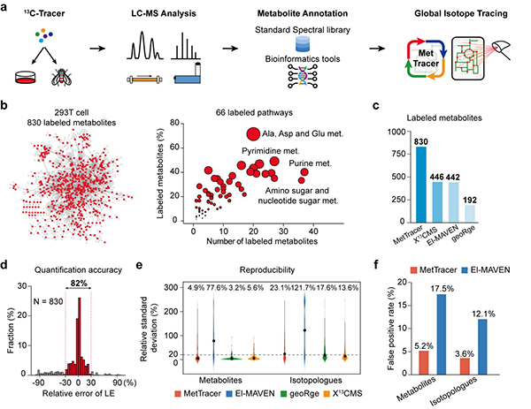 代谢是生命体的基本特征,代谢紊乱跟多种重大疾病密切相关。目前基于质谱的非靶向代谢组学研究大多是“静态分析”,即在某个时间点采样分析,难以测定生物体内代谢物合成和降解等动态变化规律。代谢流分析技术通常采用稳定同位素示踪(Stable-isotope tracing)实验来追踪稳定同位素在代谢物中的流向,进而通过测定代谢网络中代谢物的同位素分布来计算代谢物合成和降解等动态变化规律。但是,当前代谢流分析大多只靶向分析特定的代谢通路,如糖酵解、三羧酸循环、氨基酸代谢、脂肪酸代谢等,难以全面地对整个代谢组的动态变化进行大范围检测和解析,并且限制了发现新的代谢通路和代谢反应。为了对生命体的整个代谢组进行全面的代谢流动态分析,朱正江课题组结合了前期发展的大规模代谢物结构鉴定技术MetDNA(Nature Communications, 2019, 10: 1516)和稳定同位素标记代谢物检测技术,发展了基于稳定同位素标记的非靶向代谢流组学技术MetTracer。该技术具有以下特点:追踪覆盖范围高,能够对上千个代谢物同时进行稳定同位素标记的追踪;对稳定同位素标记代谢物的定量准确性高且可重复性好;大规模数据分析的假阳性低。