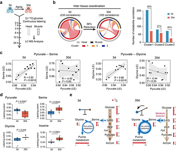 果蝇是衰老研究中常用的模式动物。该工作首先用[U-13C]-葡萄糖喂养果蝇,然后解剖果蝇的脑组织和肌肉组织进行非靶向代谢流组学的分析,在脑组织和肌肉组织中分别追踪到390个和597个标记的代谢物。通过多个时间点标记程度的聚类分析表征了代谢物可以根据标记速率分为高、中、低标记速率三类,分别富集于糖相关代谢、氨基酸相关代谢和嘌呤代谢脂肪酸合成等代谢通路。该工作重点对年轻果蝇和衰老果蝇进行了代谢稳态变化的系统性分析。相关研究发现,衰老能够调控代谢物之间的代谢关联,在果蝇衰老过程中,脑组织内、肌肉组织内、脑组织和肌肉组织间关联代谢物数目均明显降低,即衰老伴随着系统层面的组织内和组织间的代谢稳态丢失。此外,该工作还发现果蝇衰老过程中存在糖酵解代谢减弱、丝氨酸代谢增强的代谢转变,这为衰老相关的代谢调控研究提供了新思路和潜在干预手段。